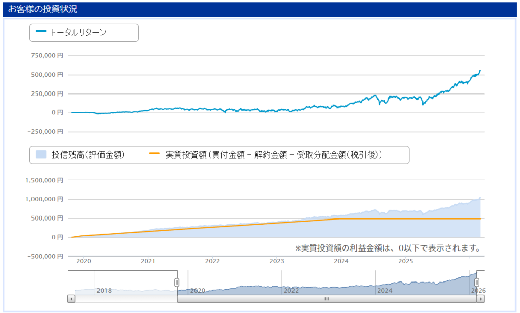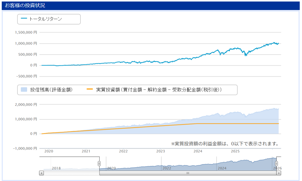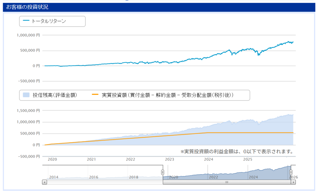 そして6年目(2026年3月現在)運用結果 投資総額172万5086円 → 評価額405万9181円 (+233万4093円)
